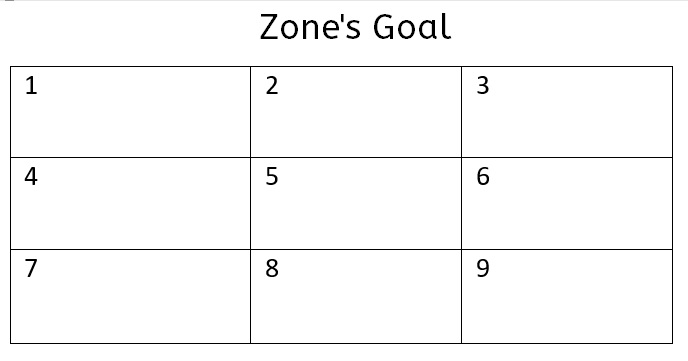 Voor de duidelijkheid heb ik de goal ingedeeld in zone’s. Zone 1 t/m 9. Zo is het duidelijk voor de trainer en keeper in welke hoek de bal gespeeld gaat worden.